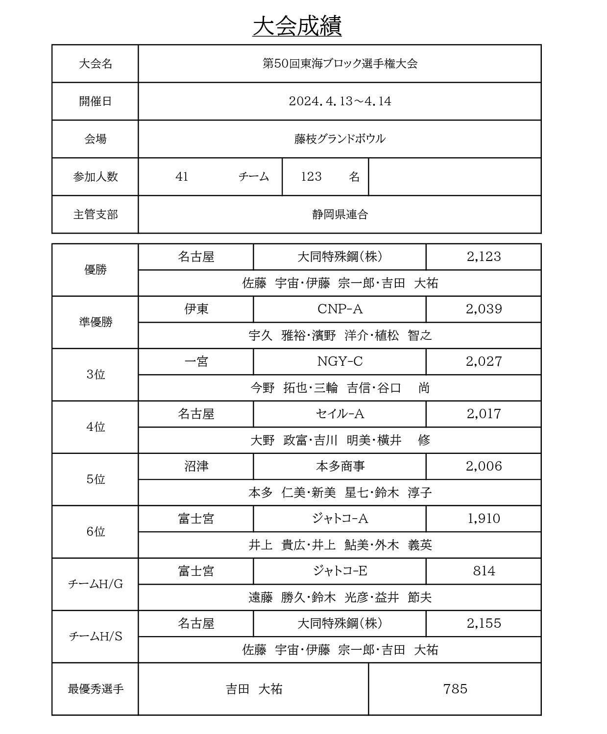 2024年5月5日 / 最終更新日時 : 2024年5月5日 東田 達也 大会結果 ●第50回 東海ブロック選手権大会 結果 《成績表(PDF)》 特別褒賞 ☆連盟大会パーフェクトゲーム達成者・連盟通算300号 ☆連盟大会800シリーズ達成者・連盟通算132号 ☆連盟大会800シリーズ達成者・連盟通算133号 過去の大会結果 ●第49回 東海ブロック選手権大会 結果 ●第48回 東海ブロック選手権大会 結果 ●第47回 東海ブロック選手権大会 結果 第45回 東海ブロック選手権大会 結果 第44回 東海ブロック選手権大会 結果 ●東海ブロック選手権大会 結果 FacebookXCopy