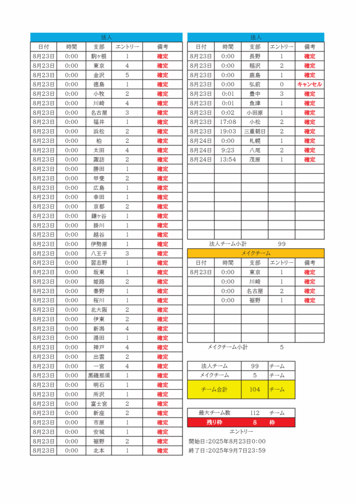 • 募集チーム数:112チーム(1ボックス1チーム、2シフト制)