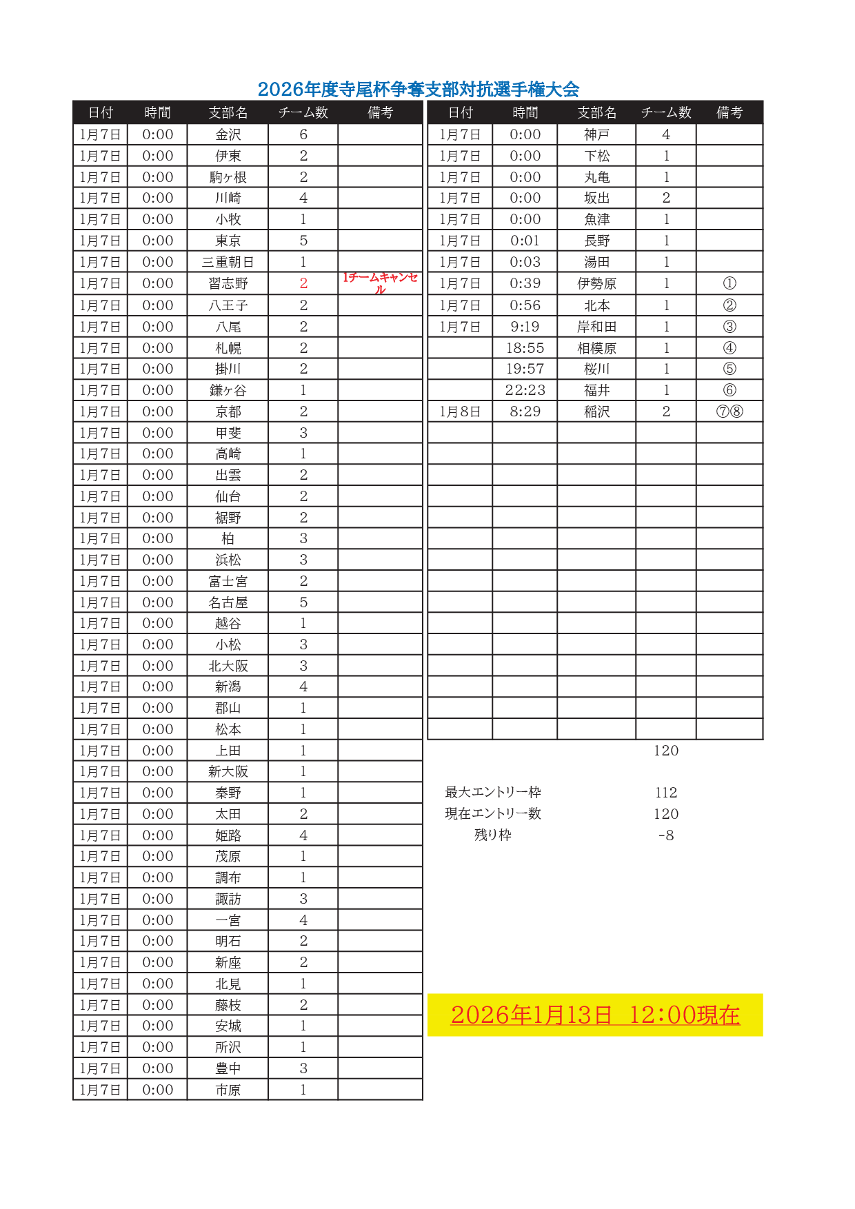 寺尾杯争奪 第52回 支部対抗選手権大会(6人チーム戦、2026年3月7日~8日、稲沢グランドボウル)の参加申込み状況(1月13日現在)をお知らせします。(備考欄 ①,②,…は、キャンセル待ちです)