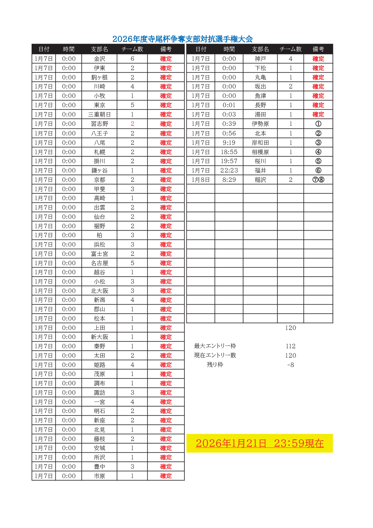 寺尾杯争奪 第52回 支部対抗選手権大会(6人チーム戦、2026年3月7日~8日、稲沢グランドボウル)の参加申込み状況(1月23日現在)をお知らせします。(備考欄 ①,②,…は、キャンセル待ちです)