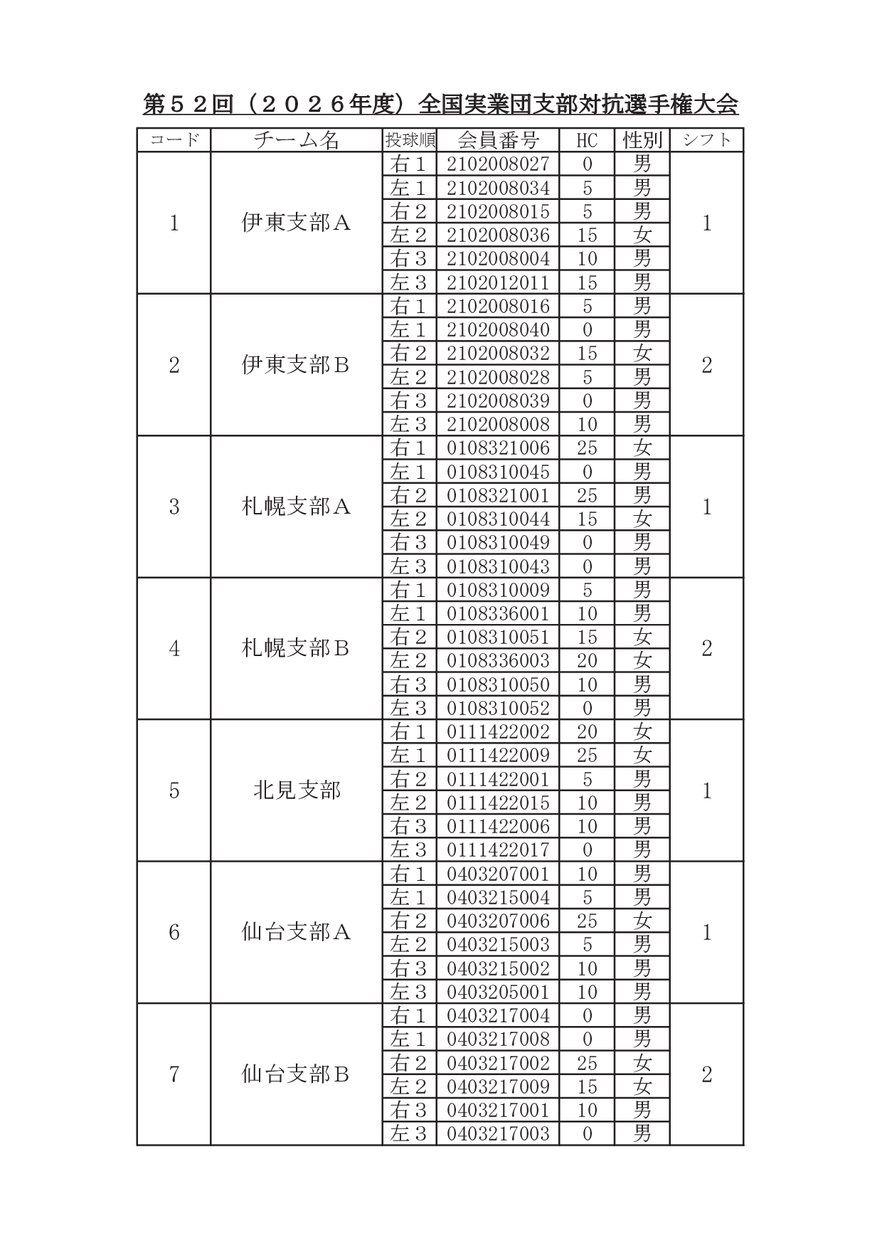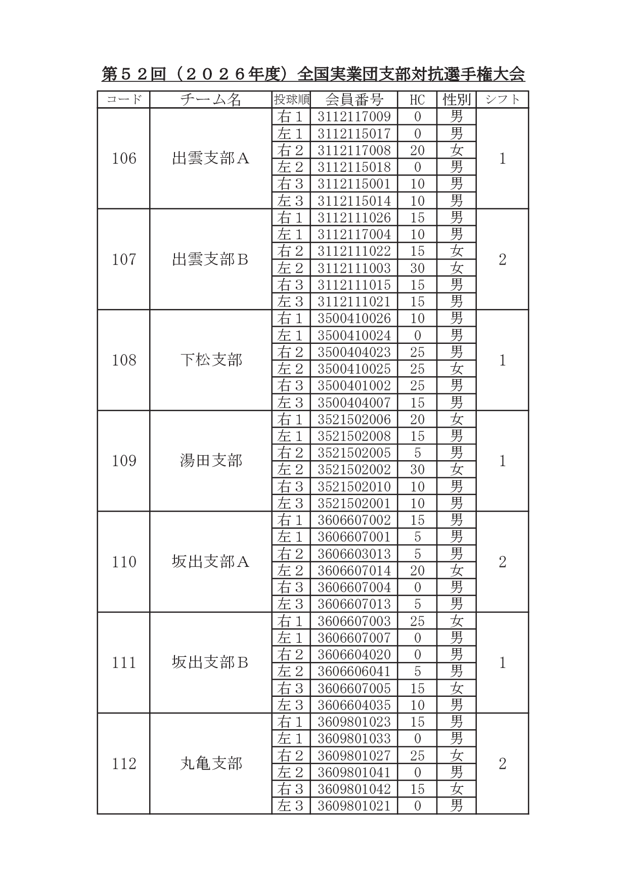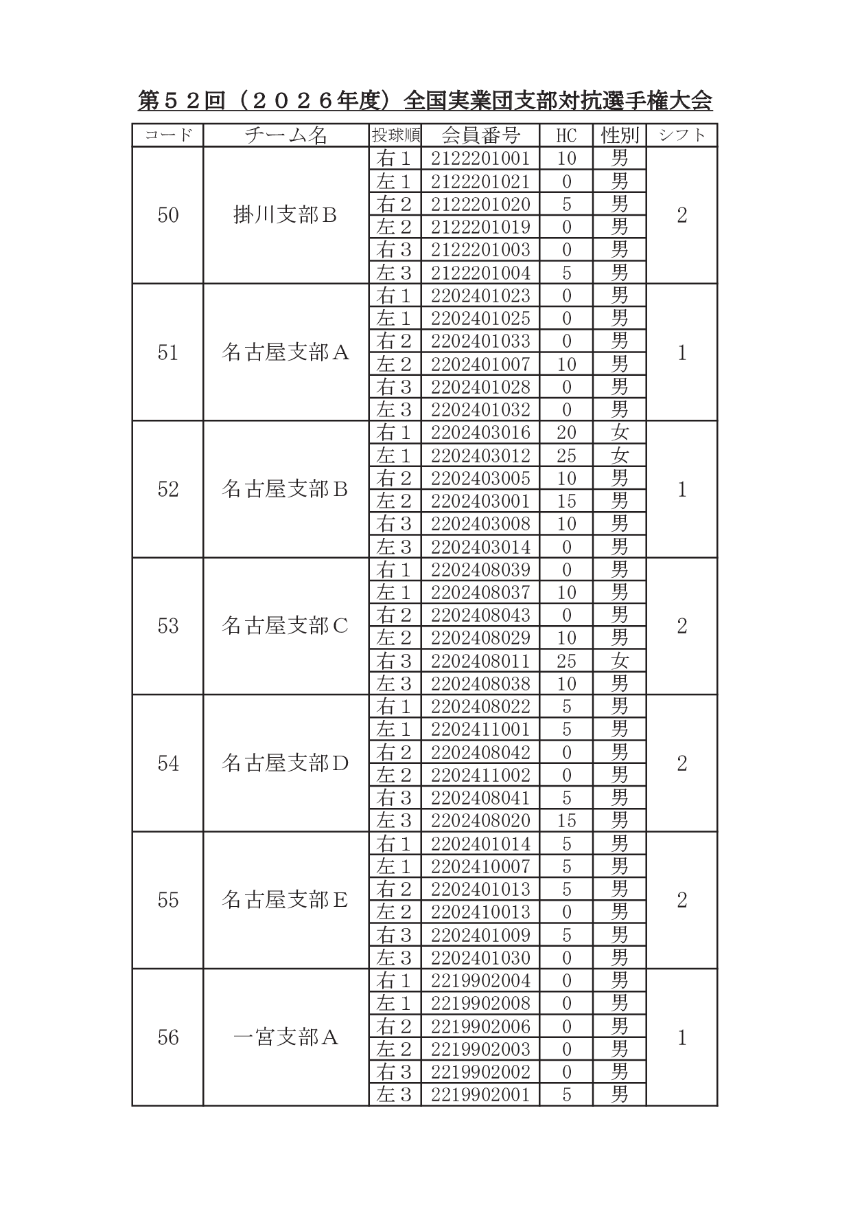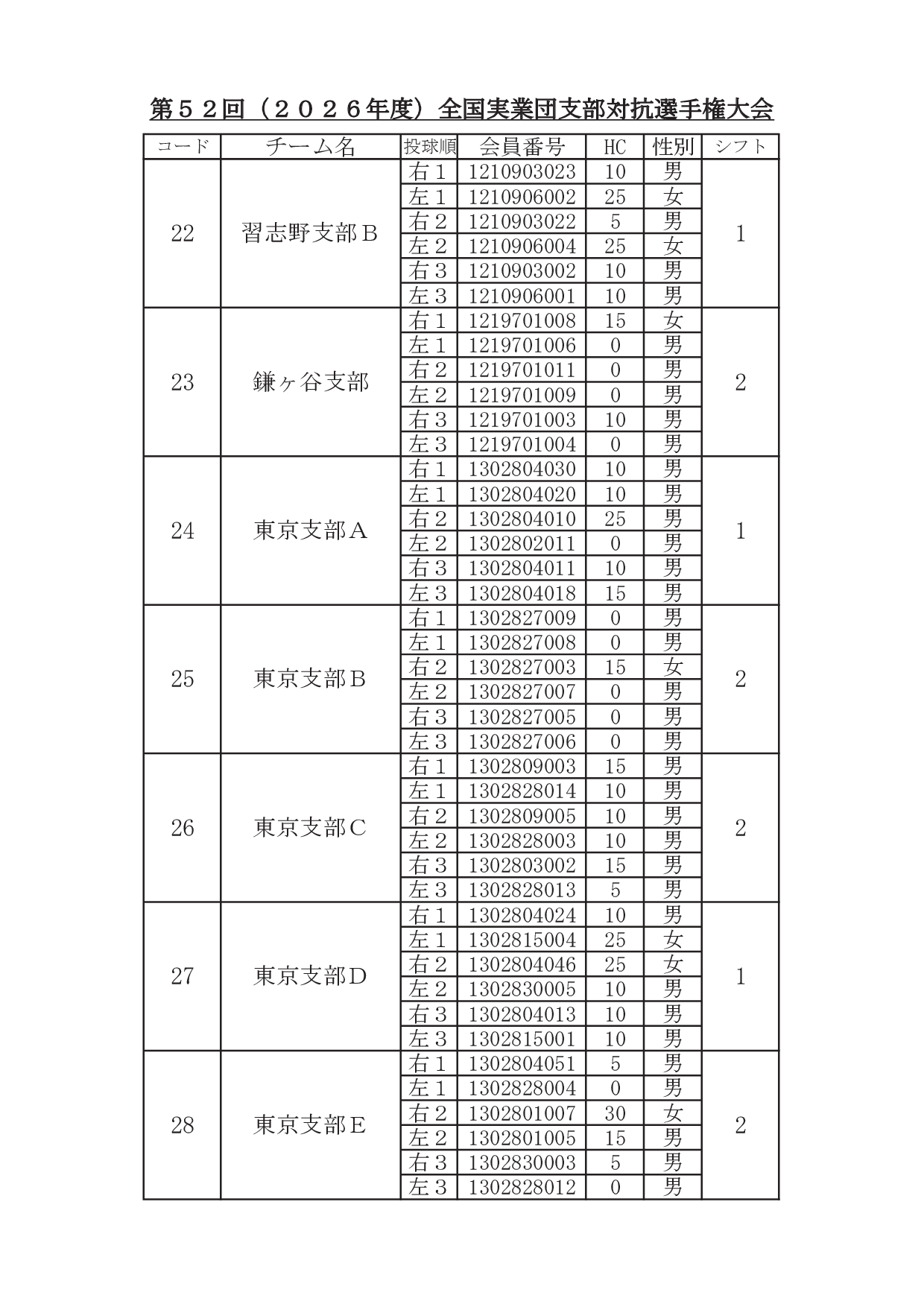 2026年1月29日 / 最終更新日時 : 2026年1月31日 東田 達也 支部対抗選手権 ●支部対抗選手権大会 シフト分け 寺尾杯争奪 第52回 支部対抗選手権大会(6人チーム戦、2026年3月7日~8日、稲沢グランドボウル)参加チームのシフト分けをお知らせいたします。 ※ 競技委員は、当日パンフレットにてご確認ください。 大会要項他はこちら ↓ ↓ ↓ ●寺尾杯争奪 第52回 支部対抗選手権大会 募集要項・申込書 ●支部対抗選手権大会 オイルパターン いいね:いいね 読み込み中…FacebookXCopy