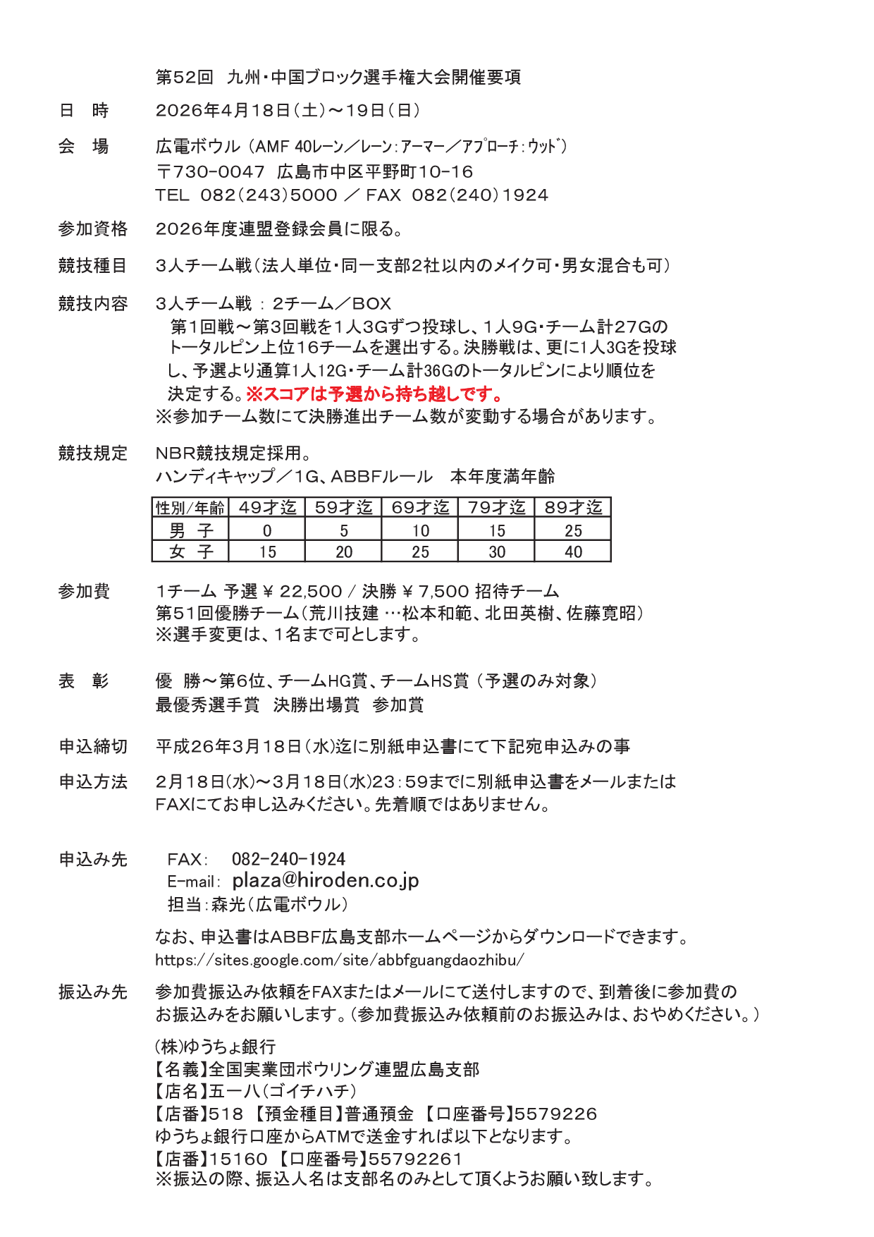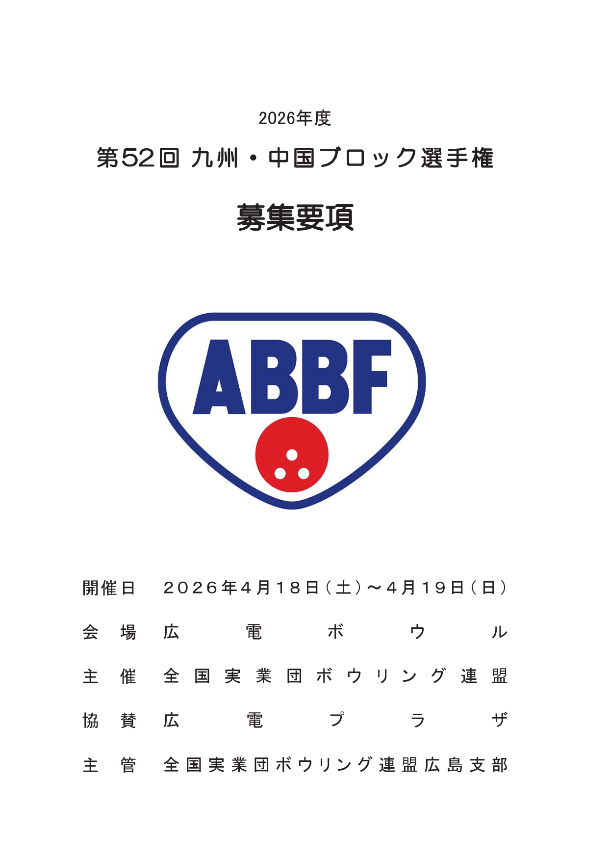 第52回九州・中国ブロック選手権大会(2026年4月18日(土)~4月19日(日)、広電ボウル)の募集要項と申込書を掲載します。