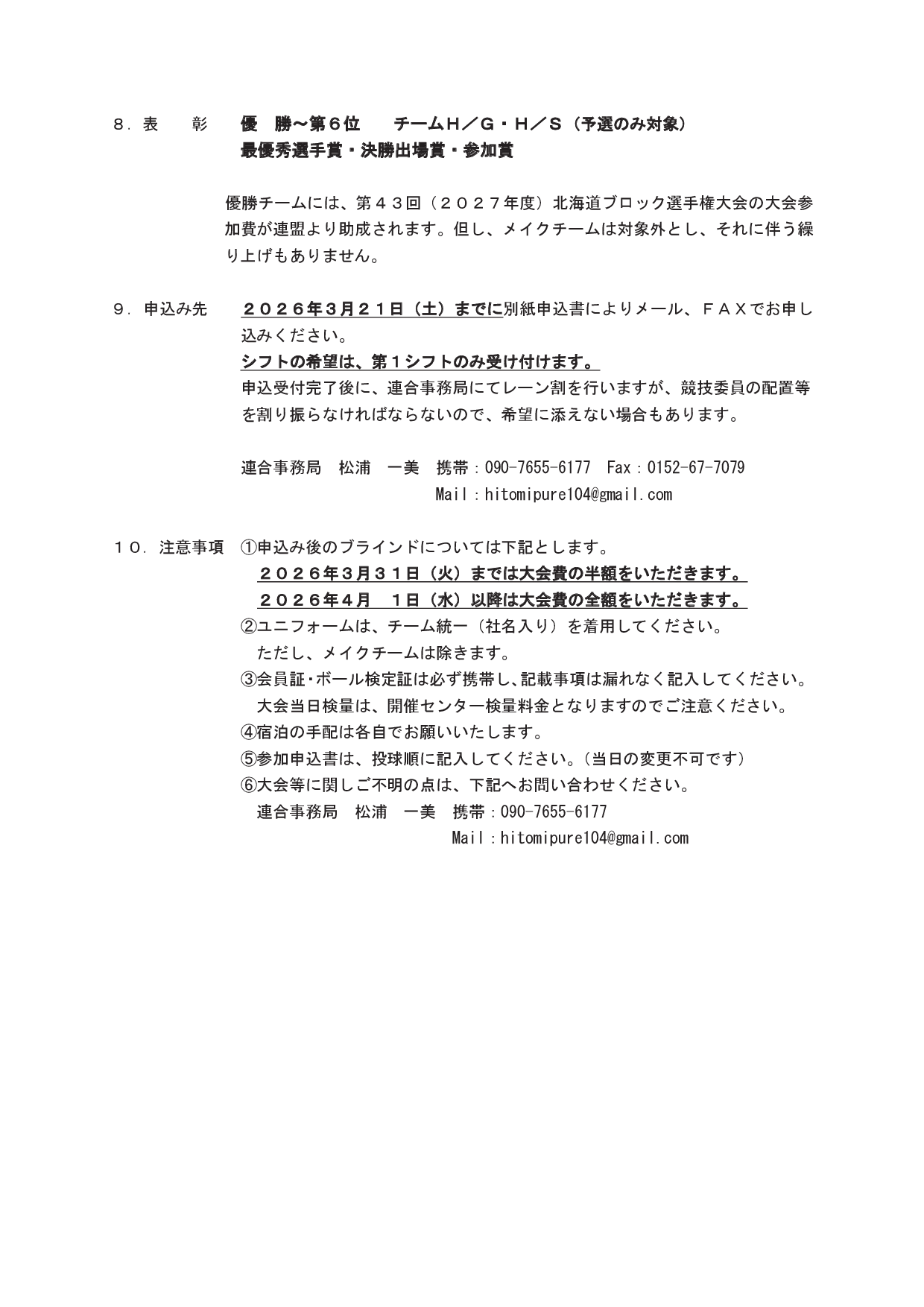 2026年2月6日 / 最終更新日時 : 2026年2月6日 東田 達也 募集要項 ●北海道ブロック選手権大会 募集要項・参加申込書 第42回北海道ブロック選手権大会(2026年4月11~12日、帯広スズランボウル)の募集要項を掲載します。 申込書部分はEXCEL形式としてありますので、ダウンロードしてご利用下さい。 ●北海道ブロック選手権_募集要項(PDF) ●北海道ブロック選手権_申込書(EXCEL) 過去の大会結果 ●第41回 北海道ブロック選手権大会 結果 ●第40回 北海道ブロック選手権大会 結果 ●第39回 北海道ブロック選手権大会 結果 ●第38回 北海道ブロック選手権大会 結果 ●第37回 北海道ブロック選手権大会 結果 ●北海道ブロック選手権大会 結果 いいね:いいね 読み込み中…FacebookXCopy