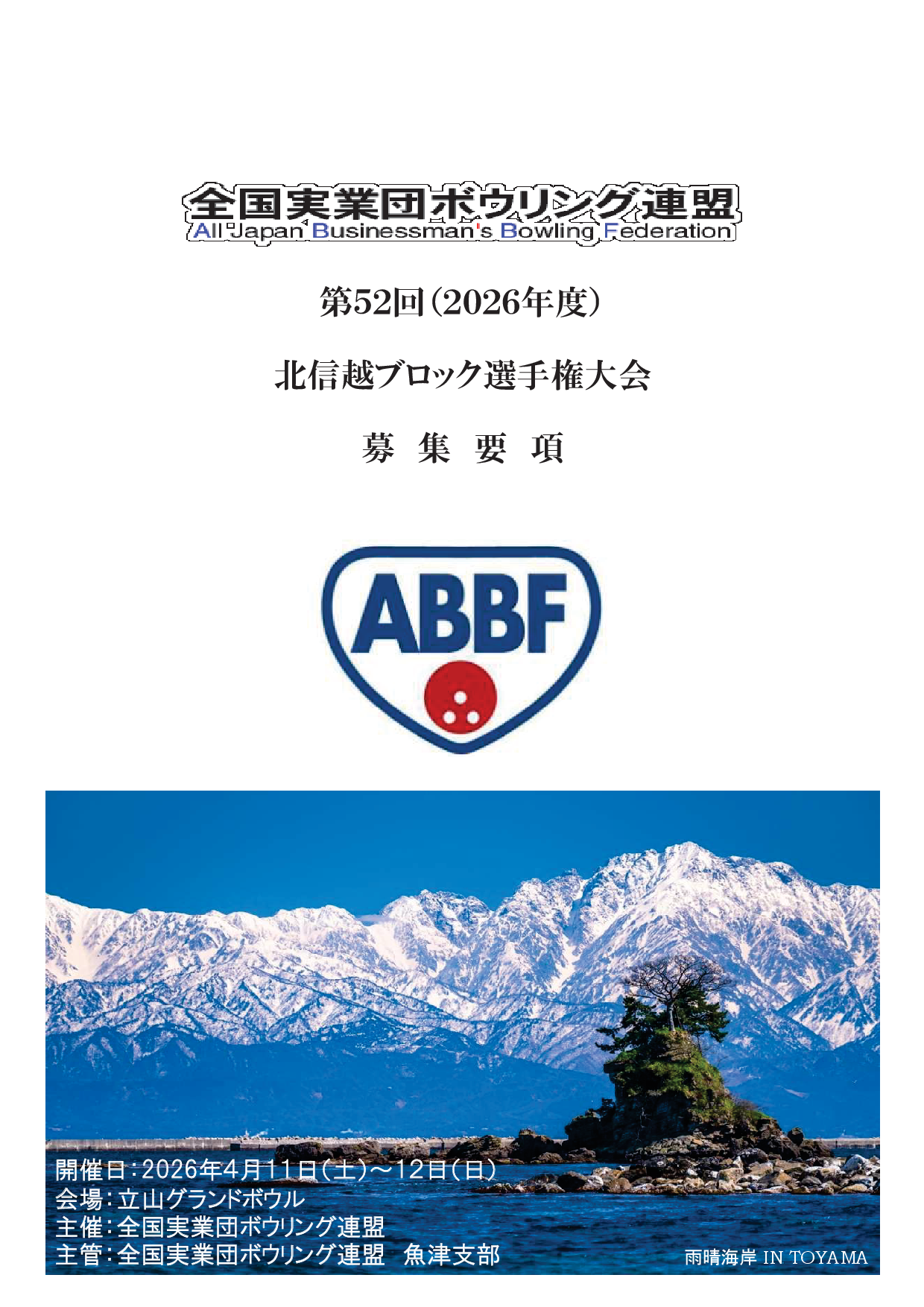 2026年2月6日 / 最終更新日時 : 2026年2月6日 東田 達也 募集要項 ●北信越ブロック選手権大会 募集要項・参加申込書 第52回北信越ブロック選手権大会(2026年4月11日~12日、立山グランドボウル)の募集要項と申込書を掲載します。 申込書部分はEXCEL形式としてありますので、ダウンロードしてご利用下さい。 ●北信越ブロック選手権_募集要項(PDF) ●北信越ブロック選手権_申込書(EXCEL) 過去の大会結果 ●第51回 北信越ブロック選手権大会 結果 ●第50回 北信越ブロック選手権大会 結果 ●第49回 北信越ブロック選手権大会 結果 ●第48回 北信越ブロック選手権大会 結果 ●第47回 北信越ブロック選手権大会 結果 ●北信越ブロック選手権大会 結果 いいね:いいね 読み込み中…FacebookXCopy