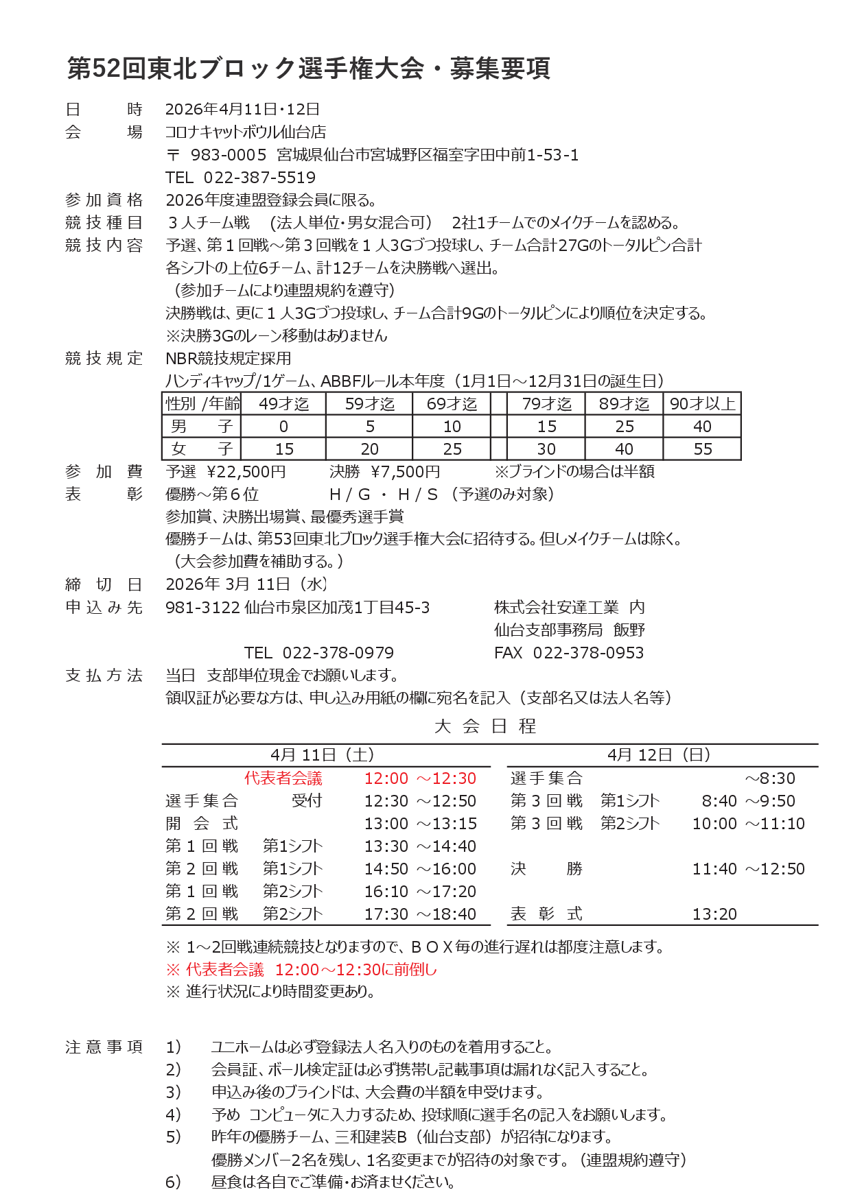 2026年2月12日 / 最終更新日時 : 2026年2月12日 東田 達也 募集要項 ●東北ブロック選手権大会 募集要項・参加申込書 第52回東北ブロック選手権大会(2026年 4月11日~12日、コロナキャットボウル仙台店)の募集要項と申込書を掲載します。 申込書部分はEXCEL形式としてありますので、ダウンロードしてご利用下さい。 ●東北ブロック選手権_募集要項(PDF) ●東北ブロック選手権_申込書(EXCEL) 過去の大会結果 ●第51回 東北ブロック選手権大会 結果 ●第50回 東北ブロック選手権大会 結果 ●第49回 東北ブロック選手権大会 結果 ●第48回 東北ブロック選手権大会 結果 第47回 東北ブロック選手権大会 結果 ●東北ブロック選手権大会 結果 いいね:いいね 読み込み中…FacebookXCopy