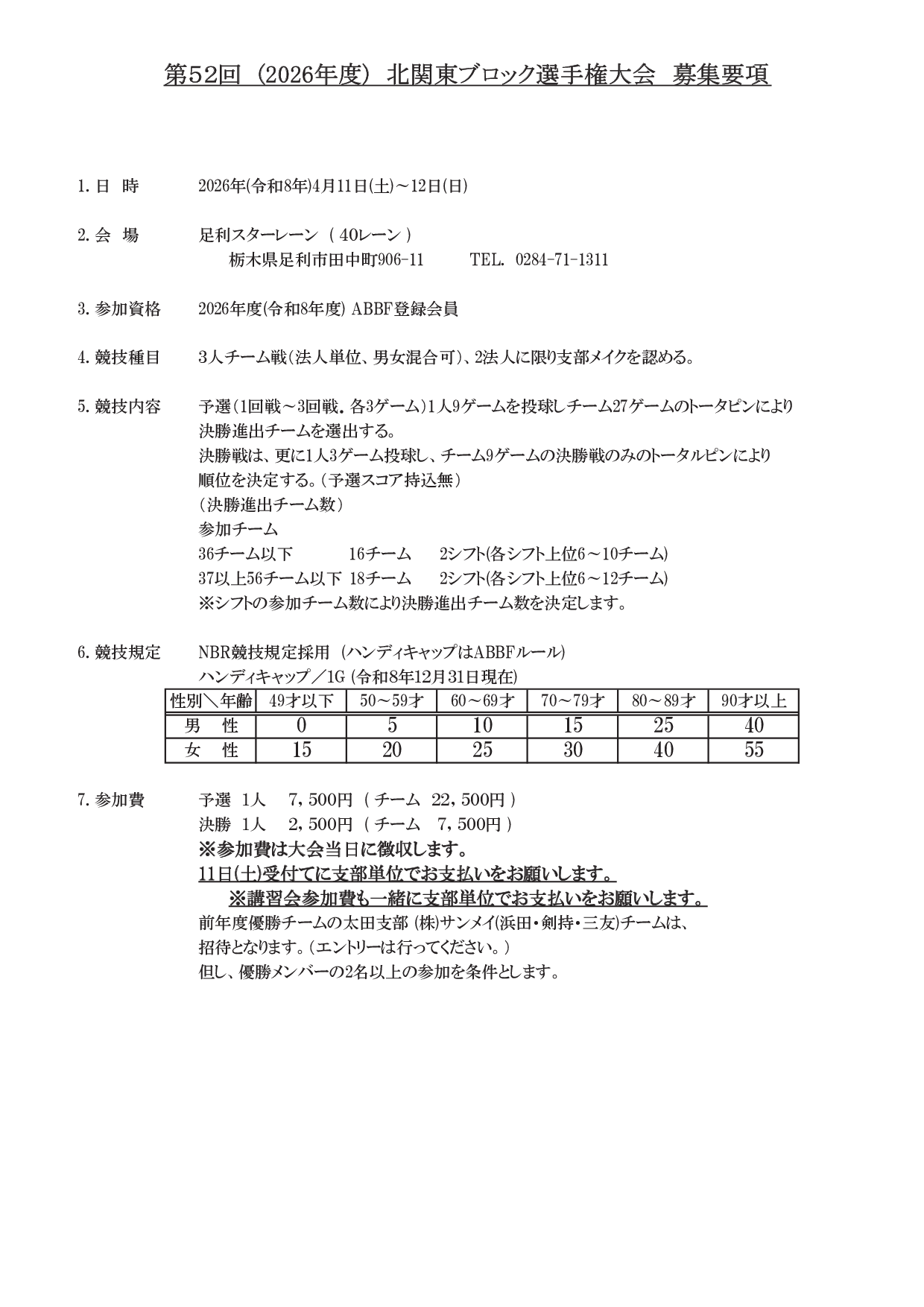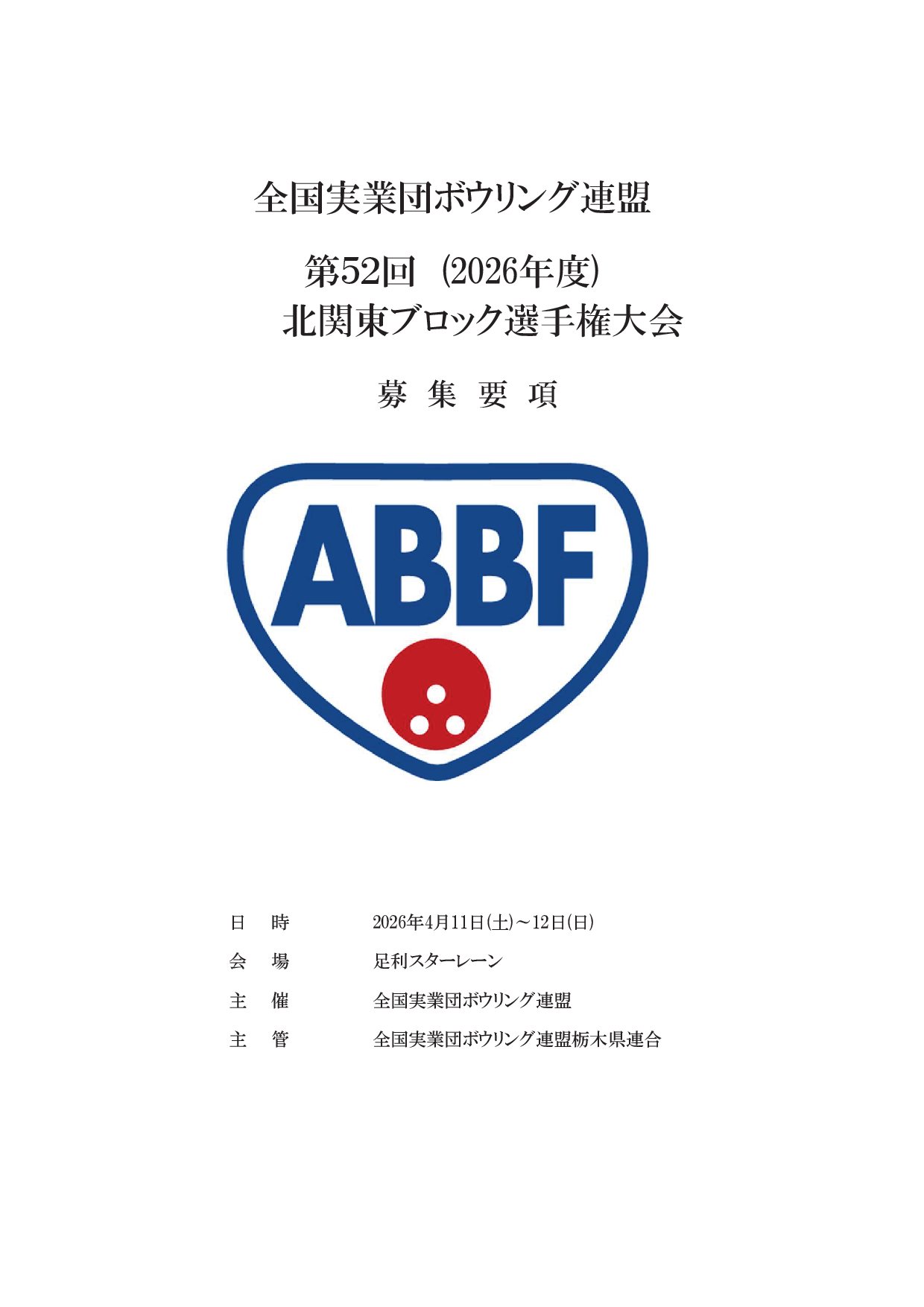 2026年2月13日 / 最終更新日時 : 2026年2月13日 東田 達也 募集要項 ●北関東ブロック選手権大会 募集要項・参加申込書 第52回北関東ブロック選手権大会(2026年4月11日~12日、足利スターレーン)の募集要項と申込書を掲載します。 申込書部分はEXCEL形式としてありますので、ダウンロードしてご利用下さい。 ●北関東ブロック選手権_募集要項(PDF) ●北関東ブロック選手権_申込書(EXCEL) 過去の大会結果 ●第51回 北関東ブロック選手権大会 結果 ●第50回 北関東ブロック選手権大会 結果 ●第49回 北関東ブロック選手権大会 結果 ●第48回 北関東ブロック選手権大会 結果 ●第47回 北関東ブロック選手権大会 結果 ●北関東ブロック選手権大会 結果 いいね:いいね 読み込み中…FacebookXCopy