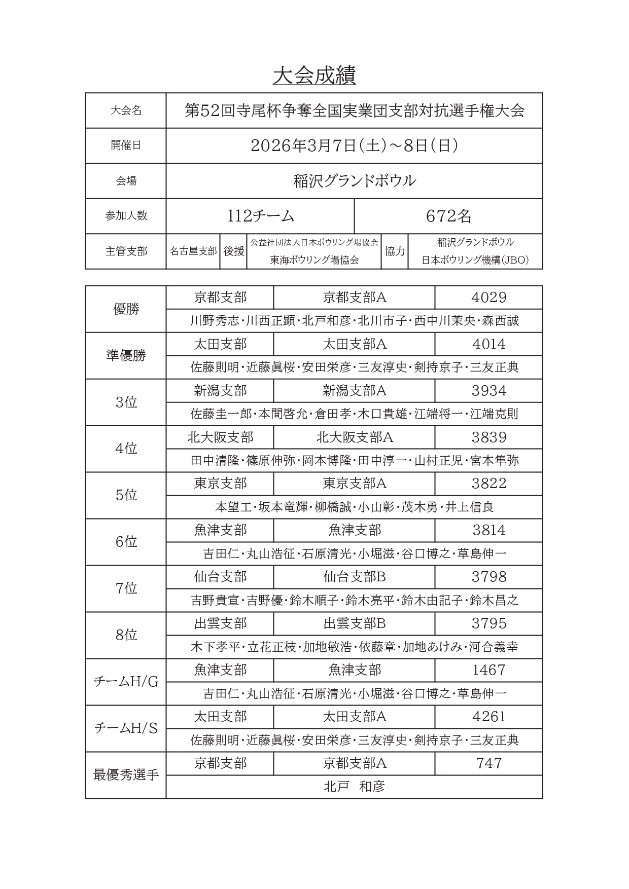 予選スコア持ち込み無しの決勝戦(3ゲーム)では、予選1シフトを6位で通過した京都支部(A)が決勝で4,029ピン(アベレージ224)をマークし、11年ぶり2回目の優勝を果たしました。同チームの北戸和彦選手(決勝747ピン)が最優秀選手に輝きました。