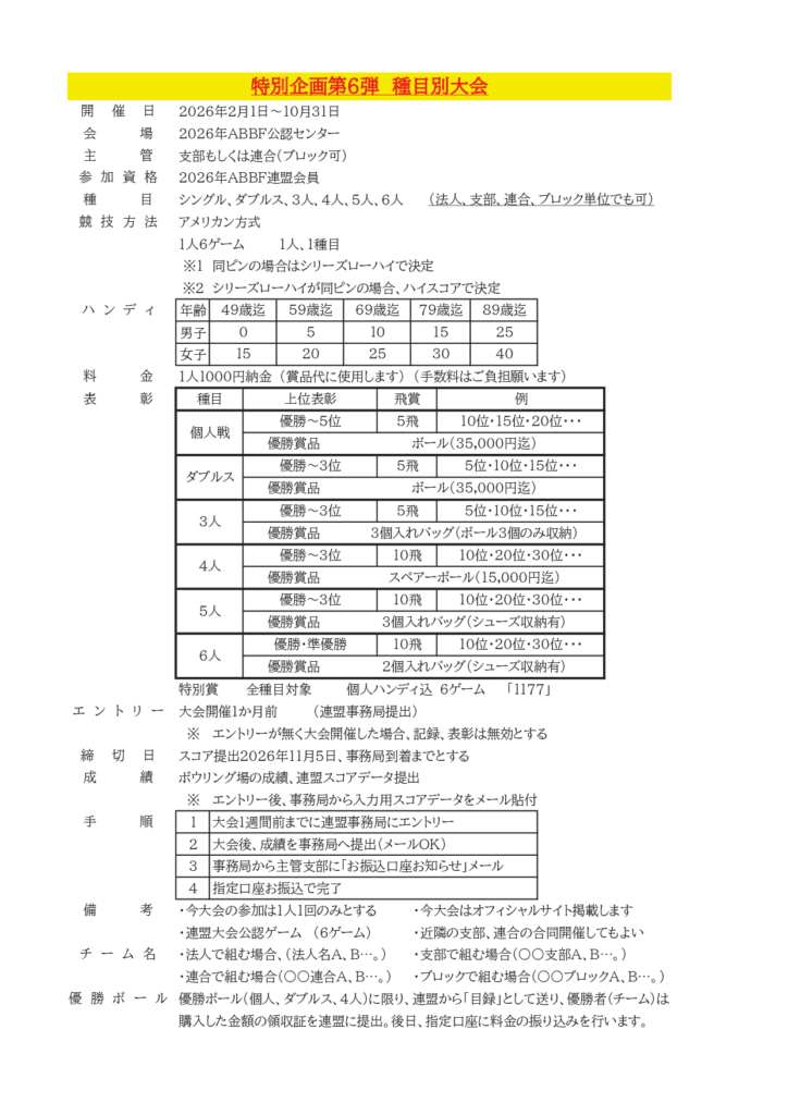 特別企画第6回 種目別大会(2026年2月1日~10月31日、各支部で開催)の募集要項・申込用紙を掲載いたします。 申込用紙部分はEXCEL形式としてありますので、ダウンロードしてご利用下さい。 ●特別企画第6回 種目別大会 募集要項(PDF) ●申込用紙(EXCEL) FacebookXCopy