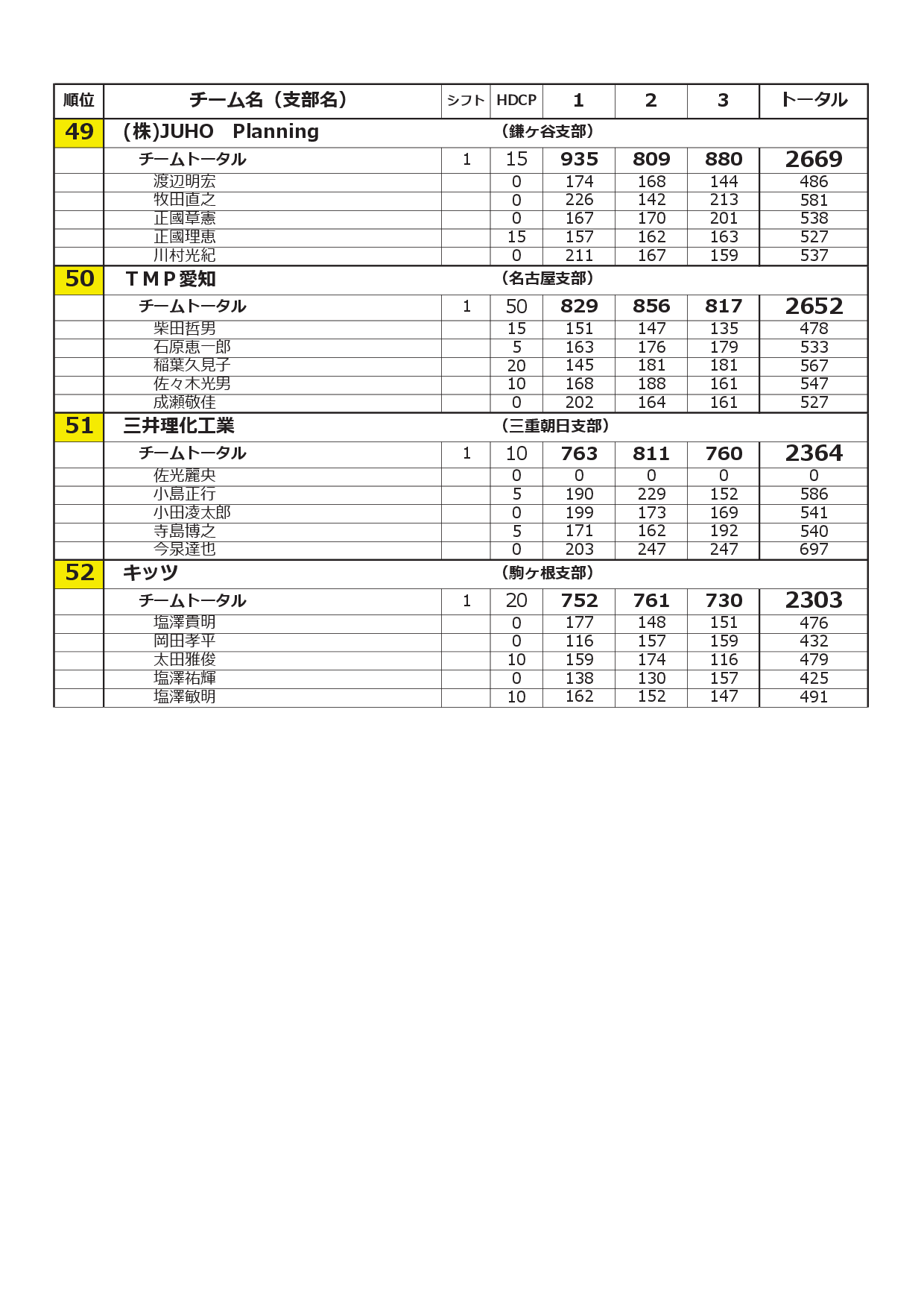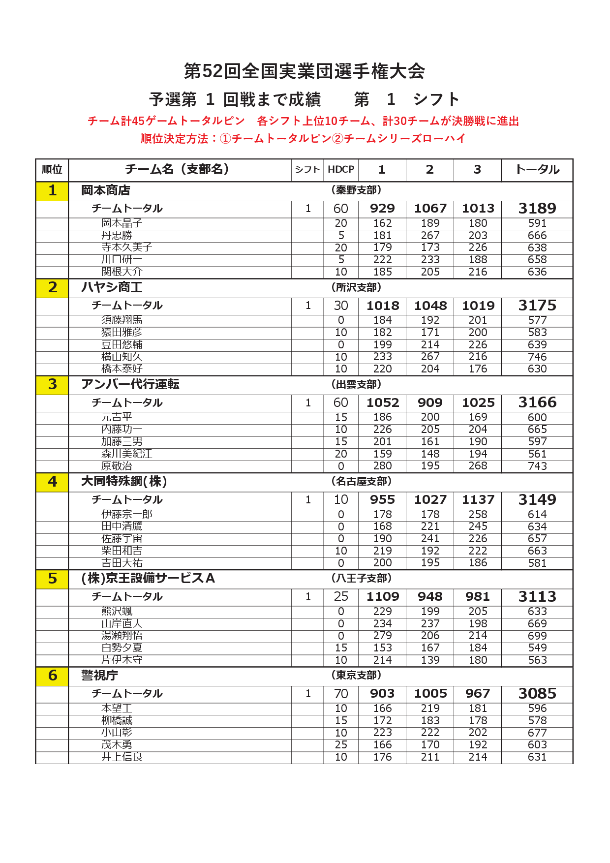第52回 実業団選手権大会<1シフト:予選1回戦終了時点>